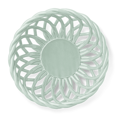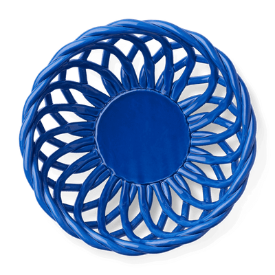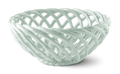 Each basket is made of delicately woven earthenware, creating a striking swirled pattern. This visual fluidity is enhanced by a fine, glossy glaze in contemporary colours.