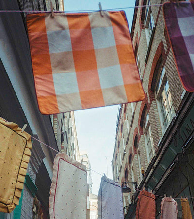 Offered here in Biscotti - featuring a terracotta background with charcoal embroidered dots and contrast piping.