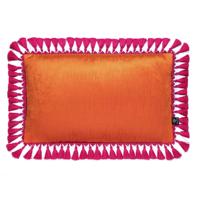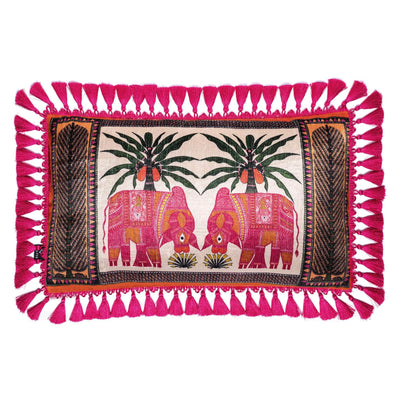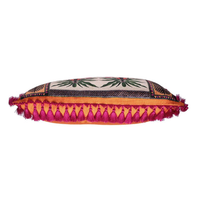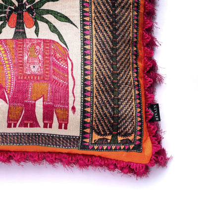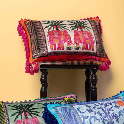 Bring the essence of Indian heritage into your home with the Nandi Cushion, inspired by Indian folk art. Celebrating the sacred cow—a symbol of nature and nurture in Hindu culture—this decorative velvet cushion features a stunning scene of grazing cows amidst palm trees and pines. Crafted from rich cotton velvet in vibrant pinks and orange, and framed with luxurious pink tassels, Gulabi Nandi is perfect as an accent or lumbar pillow. It adds a vibrant touch of Indian-inspired elegance to any space.