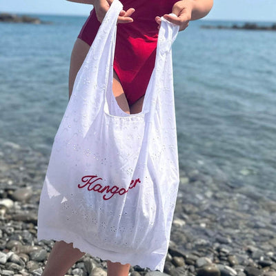 This sangallo lace sensation comes in two sizes - XL (70cm x 37cm) for those of us who can't resist carrying half the house to the beach, and S (45cm x 30cm) for the 'essentials-only' crew.