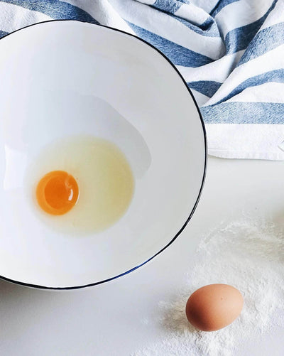 A large bowl, the largest we've ever made. Originally intended for mixing, but also excellent at serving, holding big salads, roast potatoes, a mountain of fruit, veg… or one of those to keep on a table at all times, that’s slowly filled with receipts, bits of lego, crayons and the odd apple. With a gently dimpled profile and hand-painted contrasting banding in either Cobalt blue or 24ct Gold.