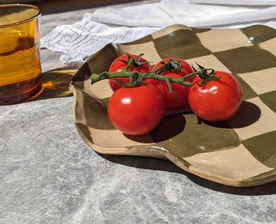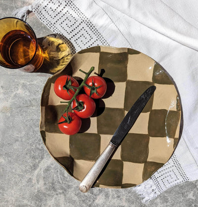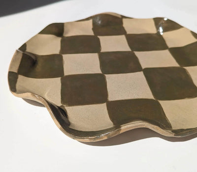 Here is the organically-shaped, irregular stoneware Olive Check Wavy Platter