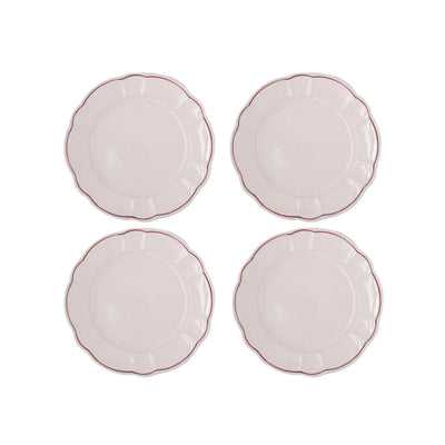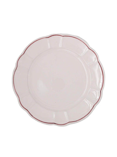Set of 4 Dinner Plates / White ceramic with a hand-painted pomegranate red rim / Dishwasher safe recommended at a gentle setting / Avoid leaving in water for long periods of time / Designed and crafted in Italy / Includes a recipe from Skye