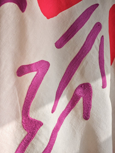 Crafted from premium European linen, this linen is digitally printed with eco-friendly dyes, featuring crewel work embroidery details. Each piece is 240 x 140 cm, perfect to use as a throw, tablecloth, curtain or even a towel.
