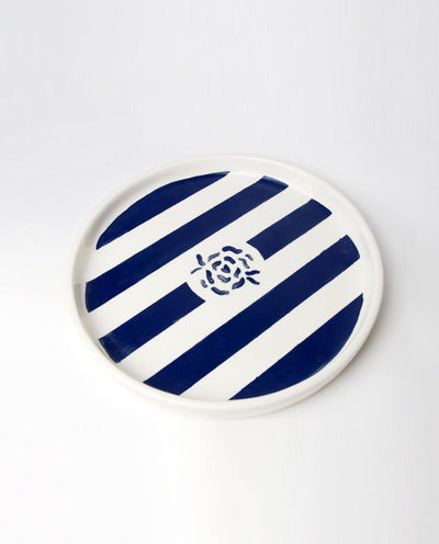 Designed for elegance and sophistication, this Royal Blue Signature Dinner Plate features a regal royal blue color stripes with our signature roses at the center. Impress your guests and elevate any dining experience with this luxurious addition to your table setting.