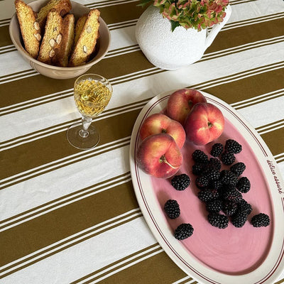 Introducing Murano Stripes, a tribute to the timeless elegance of Venice, where artistry and grandeur converge. At its heart lies our ruffled tablecloth, featuring a bold wide stripe flanked by delicate thin lines, reminiscent of Venice's harmonious balance of boldness and detail. Murano Stripes invites you to bring a touch of Venetian charm and architectural beauty to your table.