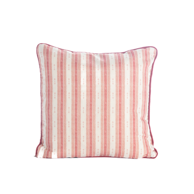 This 45 x 45cm cushion is covered in Red and Pink Salzburg Stripe on both sides with a beautiful deep red muslin gauze piping. It is available with or without cushion inner.