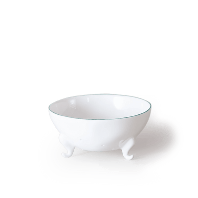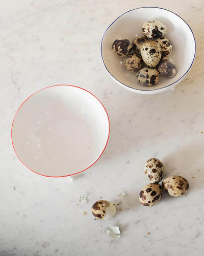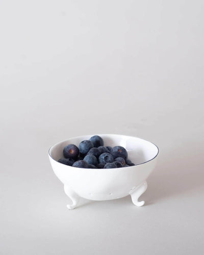 Berry bowls - little fine bone china colanders, raised off the tabletop with hand-formed feet - are the perfect size for a punnet. Lovely enough to wash and go straight onto the table, they are a supremely elegant way to get bugs out of your berries. They come in two sizes, small and medium. For small and medium sized berries, respectively. This, the smaller size, is perfect for blueberries or currants. Or filled with quail's eggs (pictured) or olives.  Each bowl is hand made in our Devon workshops with our characteristic uneven tactile body, three little feet straight from a storybook and a hand-painted band around the rim in either Cobalt blue or Geranium red. The holes are each hand-punched - these are truly a labour of love. A beautiful object to have on the table and countertop, and one that is endlessly useful too. A perfect object for life.