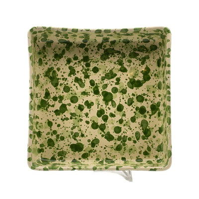 This simple square platter is a go-to shape, easy and versatile. We love it for making delicious spoon desserts like Tiramisù, an Italian classic. Handmade & hand-painted 2 tone Tuscan green on a soft yellow base splatter ware.  All products are 100% lead free and approved for alimentary use.