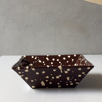Introducing our exclusive serving bowl, crafted with Italian expertise. The square shape, deep like a dark chocolate square, adds a touch of elegance to your table. The chocolate brown glaze and delicate cream decor make it a perfect addition to any occasion. Combine with our mini chocolate square bowls for a complete and luxurious dessert experience.