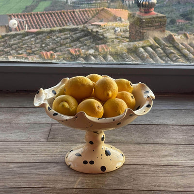 Add a touch of modern chic to your dinner parties with the Curvy Serving Bowl with Stand. This centerpiece tableware, inspired by Italian tradition, will elevate your hosting game. Impress your guests with its unique design and functionality. A must-have for any elegant occasion. Handmade and hand painted by our artisans in Deruta, Umbria. The decor is a manganese splatter pigment on an avorio cream glazed base. These products are 100% lead free and are approved for alimentary use.
