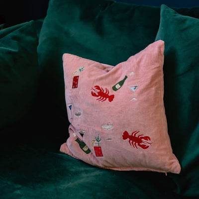 The Doodle Cushion, an embroidered representation of what all my sketchbooks end up looking like. Perfect for a maximalist, cocktail loving, lobster lover!