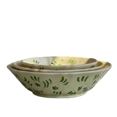 Indulge in the luxury of The Vines 3 bowl Serving Set! Each bowl is hand-painted with exclusive vine motifs, adding a touch of elegance to your dining experience. Perfect for serving salads, pasta, or fruit, this set makes a stunning table centerpiece. Elevate your dining with this Italian-inspired set. Tuscan green on an avorio glazed base.