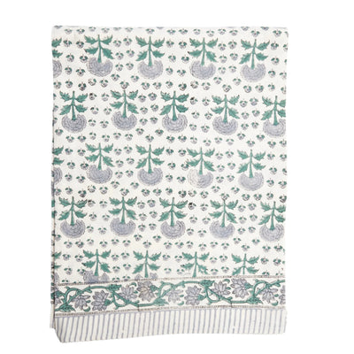 A charming floral tablecloth printed in shades of blue and green.  It works well with all the products, and the like to team it with the white rattan tablemats and pale green candlesticks.