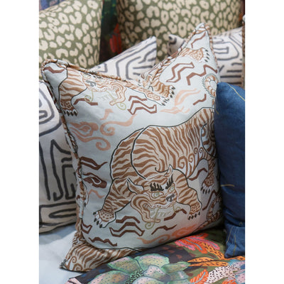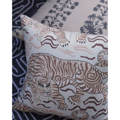 • Tigers of Tibet is our popular interpretation of this mythical creature and artistic form from the ancient lands of Tibet. Inspired by centuries-old carpets, these strikingly whimsical tigers are oversized and take up the width of a pillow with their twisting tails and pouncing pose.