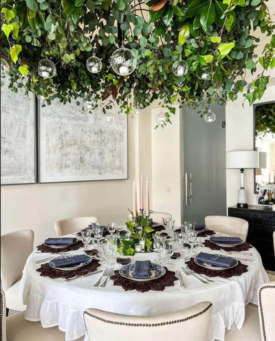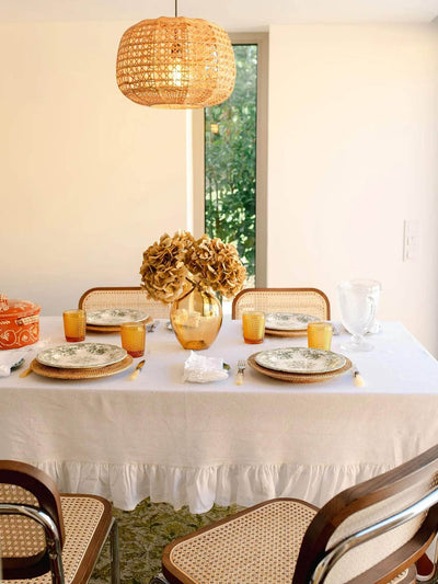 Aida's white linen with cotton ruffle tablecloth is our best-seller when it comes to creating a sophisticated table setting. Combining the softness of cotton with the durability of linen, this tablecloth offers the perfect balance between comfort and elegance. The ruffle detail adds a touch of charm and refinement to its design, making it a very popular choice among our customers.