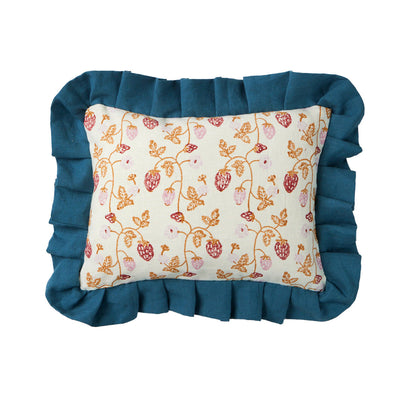 Size: 30 x 40cm Hand block printed linen on the front with a plain hand dyed linen on the back Zip at bottom Feather pad included