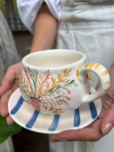 A limited collection ceramic mug + saucer, handmade in ceramic, hand painted, you will get a random design, as they are handmade and unique designs, the design is only found in Placement and is guaranteed to add variety in the day to day in your home.