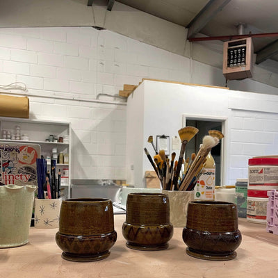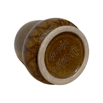 Signed on the base before firing once to 1000 degrees celsius. The piece is then waxed on the foot and dipped into a homemade glossy honey glaze. Decorated using iron oxide then once dry the piece is ready for its final 1230 degree firing.