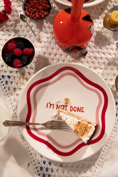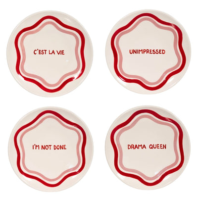 Set of four artisanal ceramic dinner plates, each hand-painted with bold, witty phrases that say exactly what you’re thinking — with style.