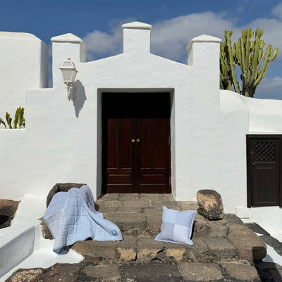 This quilted patchwork pillow cover features a medley of blues – from soft sky to deep denim.