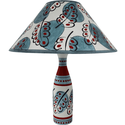As seen in The New York Times Style Magazine's Crafting With T series where Cressida Bell shared her step-by-step guide to help you create a simplified version of this shade at home. This hand painted paper coolie lampshade is covered in the signature Paisley Leaf pattern in blue with red dots on top and is perfect for pairing with the Blue Paisley Leaf Carafe table lamp base.