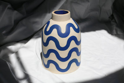 Handmade large beehive vase in stoneware hand painted in green or blue wave, glazed internally.