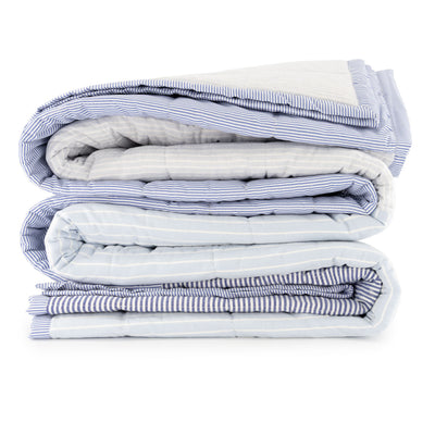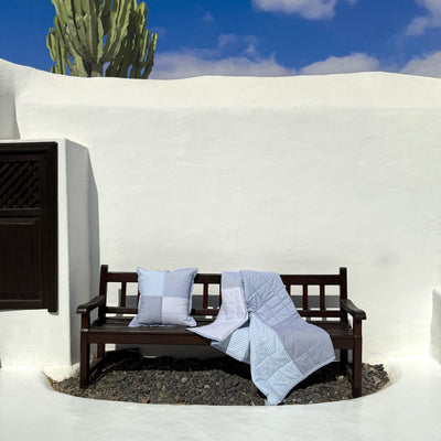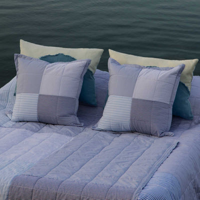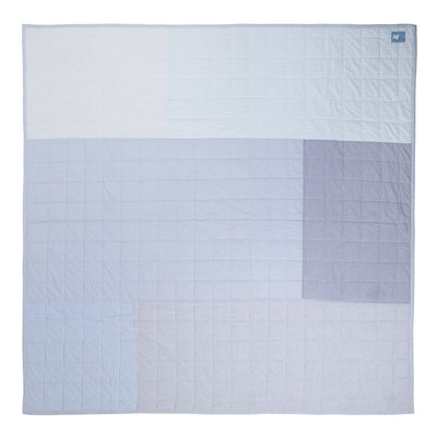 This quilted patchwork throw features a medley of blues – from soft sky to deep denim – along with white and gradients of gray.