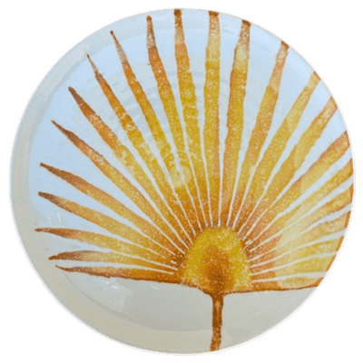 Handpainted ceramic plates with colorful touches of palm leaves.
