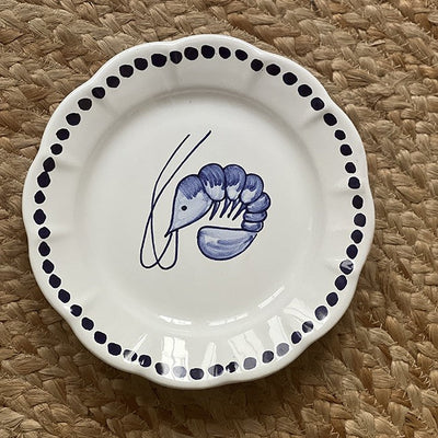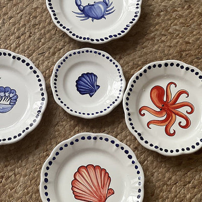 This artisanal collection, handcrafted in Italy, beautifully blends red and blue shellfish motifs with a delicate dotted border — bringing a touch of coastal charm to your table.