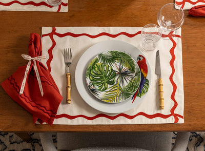 Inspired by the glowing sunsets at Isla Capricho, the Atardecer Wave Placemat in coral red adds warmth and vibrant charm to your table. Featuring a bold wavy embroidered border on an ivory cotton base, it brings a touch of relaxed elegance to any meal—from golden hour dinners to everyday gatherings.