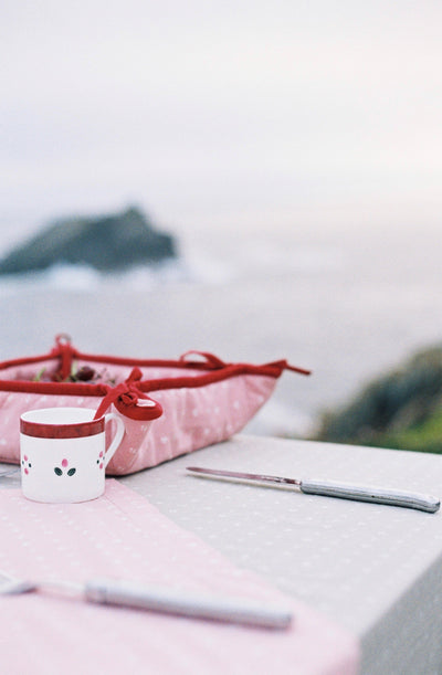 These are called bread baskets in Austria, but we use them for everything. They work as well on the breakfast table as they do on your dressing table, or in your bathroom. They tie at each corner and can be untied and thrown in the wash whenever necessary. Please note, each basket is entirely unique as there will be natural irregularities in the print due to the hand block printing process.