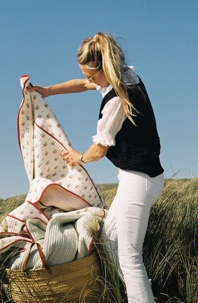 Hand block printed in India, these reversible quilts have our Blume print on one side and a faded red stripe on the other. Double bound in our signature deep red piping, they are as smart as they are cosy. The Single Size fits generously into a cot and also works very well as a playmat. Please note, each quilt is entirely unique as there will be natural irregularities in the print due to the hand block printing process.