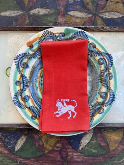 Made in Egypt from a refined linen-cotton blend, this dinner napkin elevates the table with timeless color and quiet symbolism. Rendered in terracotta and finished with embroidered Chimera in lilac, it’s a statement in myth and material.