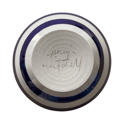 Fired once to 1000 degrees celsius, then signed, waxed, and dipped into a glossy transparent glaze. Decorated by hand with cobalt oxide. Once dry the piece is ready for its final 1230 degree firing.