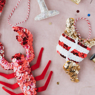 All sequins are carefully sewn on one by on by Kate and her small team in the UK, every single piece is entirely hand made especially for you making it the most unique and desirable ornament.