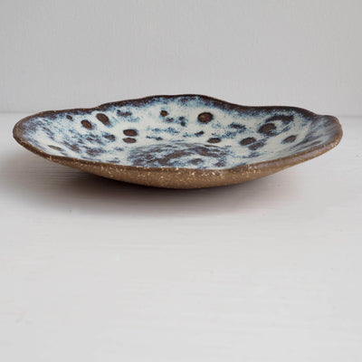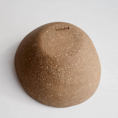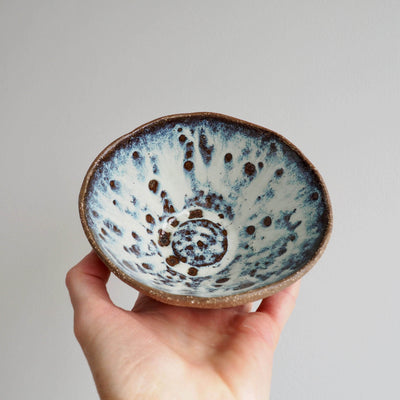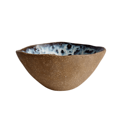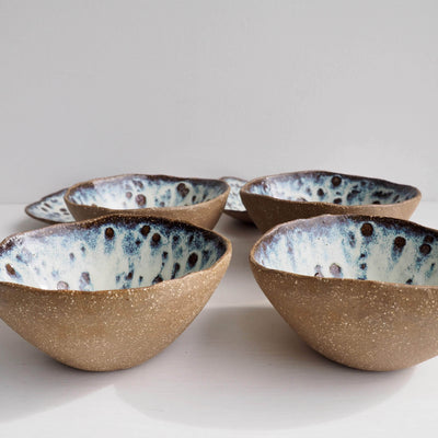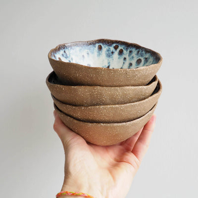 Handmade speckled brown stoneware bowl in slightly irregular round and oval shapes glazed with a speckled reactive cream / blue glaze.