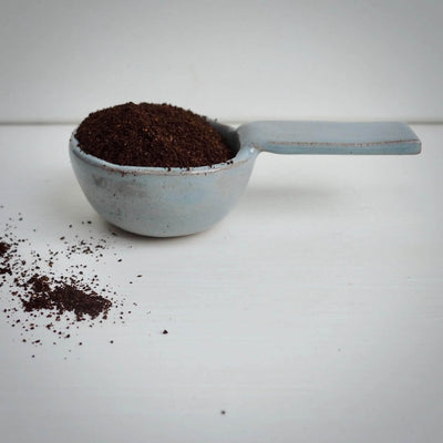 The scoop holds approx 1 large tablespoon. - it is the perfect amount for a stovetop moka pot. This scoop is great for coffee/tea/ herbs/salt etc Made from stoneware clay and glazed in white dinnerware safe glaze. This scoop has a bowl shape and a short handle and the base is unglazed.