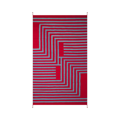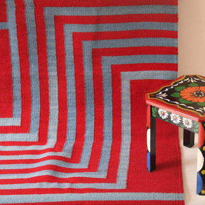 A striking naturally dyed flatweave rug featuring a geometric pattern and vibrant colours derived from indigo and cochineal, an ancient dye that is derived from cactus-eating insects. The rug is handwoven by a family of artisans using locally sourced wool.
