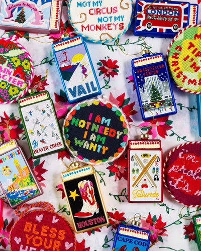 Wanderlust for your tree. Iconic hot spots from dreamy destinations reimagined in charming glass keepsake Christmas tree ornaments.  Take your holiday decor from trad to rad with Furbish's curated assortment of festive AF needlepoint pillows, ornaments, tree toppers, stockings, and tree skirts.