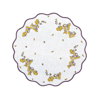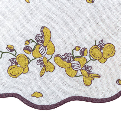 These beautifully hand crafted circular placemat feature a playful interpretation of orchids. Each orchid is thoughtfully placed, with flowing, organic lines that add movement and lightness to the composition. The hand-cut edge detail enhances the shape, echoing the curves of petals and giving the piece a sculptural finish.