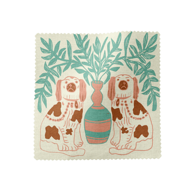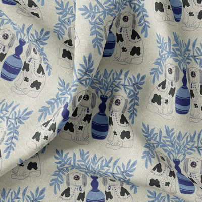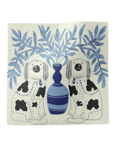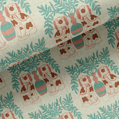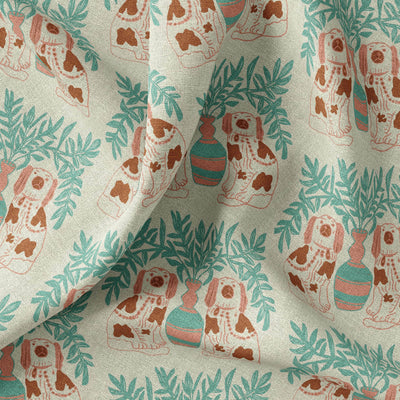 The Pair of Dogs linen brings a delightful burst of joy to your interiors, reviving a quintessential Victorian symbol of prestige. These charming Staffordshire dogs, traditionally a mark of status, are reimagined to stand loyally on your fabrics, offering companionship and a touch of whimsy to any room.