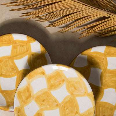 Geometric patterns, radiating lines, and dancing strokes across glazed clay… Each piece is individually handmade and hand-painted by artisans in Morocco—no two are alike, and natural imperfections reflect their artisanal nature.