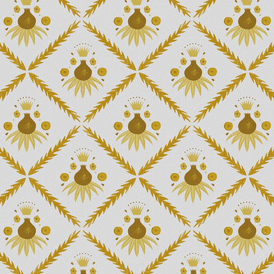 The 'Pome' print features an abstract pomegranate motif framed by a traditional trellis design. Printed in muted shades of yellows set against a natural off white background. Printed onto a luxury textured paper in the UK. Collection: Pome Colour: Buttercup Yellow Print method: Digital Hanging method: Wall paste Wall coverage: 7m2 Pattern repeat: 11CM Roll dimensions: 0.7m x 10m