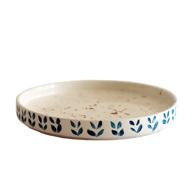 This stunning ceramic dessert plate boasts a playful purple splash of color on the inside, accented by a charming leaf outline in a fun petrol hue. With a variety of complementary color options, each plate features its own unique, hand-painted design.