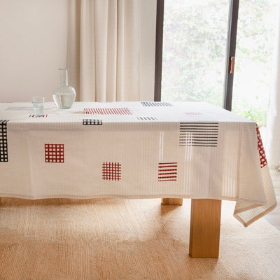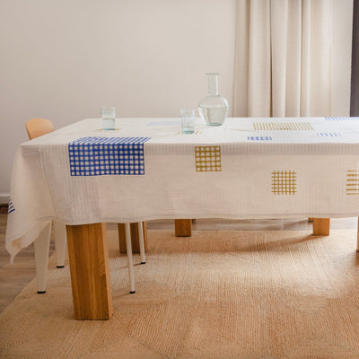 The RACINES CARRÉS pattern tablecloth is made of Calico and is printed by hand in Beirut using hand carved woodblocks.