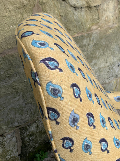 Hi, please meet Ruby and add a touch of fun to your living room. Ruby is fresh out of Upton Noble's workshop and is looking for a great home. Ruby is upholstered in a Robert Kime fabric. The print of the fabric has an intended worn look to it. With its mustard yellow and blue checkered pattern Ruby creates a design style that brightens up every room.