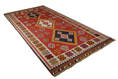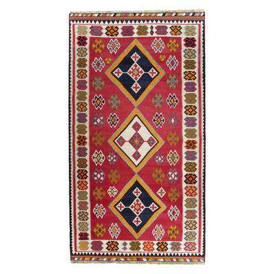 The Gashgai are Turkish-speaking nomadic tribes living in the region around Shiraz in southwest Iran. Kilims are flat, reversible wool rugs with a typical slit weave. This means that the weft has slits where the colors change. The rugs feature classic Gashgai motifs such as rhombuses, squares, stripes, and Caucasian star patterns. Colors such as blue, yellow, red, green, and beige are used.