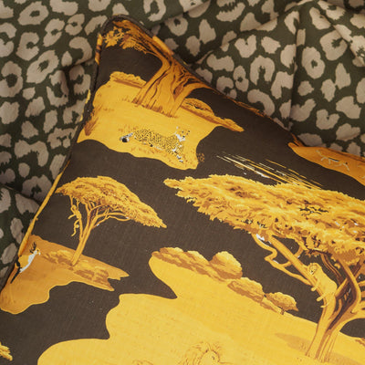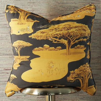 Serengeti Pillow Cover in Walnut Description Untame your interiors with this wild pillow that includes some of our favorite animals of the African plains! This lively print will add an exotic twist to your style in a dark walnut and golden yellow colorway.