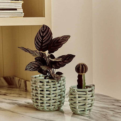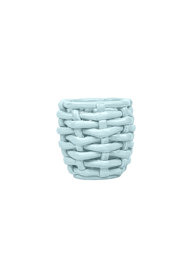 Handwoven sky blue ceramic basketweave pot. Use this glazed planter for your plant pots or as a pot to hold anything around the house, from a kitchen utensils holder to storing paintbrushes or toothbrushes. Upgrade uninspiring pots and make your house plants a feature on a table or shelf. This piece is handwoven in Portugal using strips of clay by a highly skilled clay weaver. This time-honoured basketry technique is very rare and makers are hard to find. The final glazed result is a real showstopper. The planter can fit a plant pot up to 9.5cm in diameter. 13cm high. These products are completely handmade and therefore every piece is completely unique and may vary slightly in size or appearance. Please note that plants should be removed to be watered as the sides of the basket are not watertight.